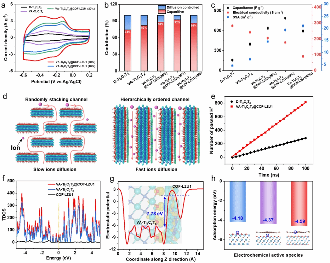 ❖密度泛函理论计算了COF与Ti3C2Tx界面的电荷密度。Ti3C2Tx的平均静电势 (-5.29eV) 高于COF (1.06eV),表明了电子在强静电场中从Ti3C2Tx迁移到COF,确保了良好的界面电子传递与COF表面充分的氧化还原反应,获得了较好的倍率性能和法拉电容。此外,H+在COF@N-Ti3C2Tx/DPA表面的吸附能 (-4.71eV) 大于Ti3C2Tx/DPA表面的吸附能 (-4.18eV),说明了COF在Ti3C2Tx上的锚定有助于加速离子动力学迁移和存储。