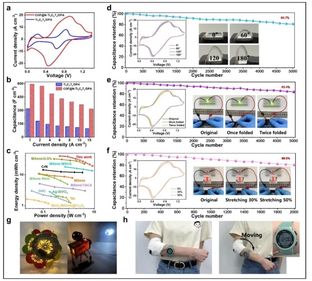 ❖构筑的固态D-SCs具有高能量密度 (40.5 mWh cm-3) 和大比电容 (595.5 F cm-3),为LEDs、灯笼、投影仪和智能手表供电。同时,D-SCs在5000次弯曲、2000次50%拉伸和5000次折叠后,分别具有80.7%、80.6%和83.4%的电容保持率,表现出较高的形变稳定供电能力。