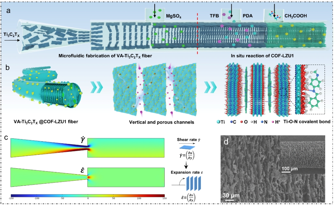 图1. VA-Ti3C2Tx@COF-LZU1复合纤维的微流控纺丝制备、流体力学计算与形貌图。