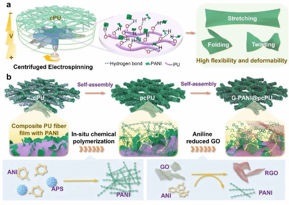 离心静电纺丝化学构筑石墨烯-聚苯胺分级结构织物用于可拉伸超级电容器