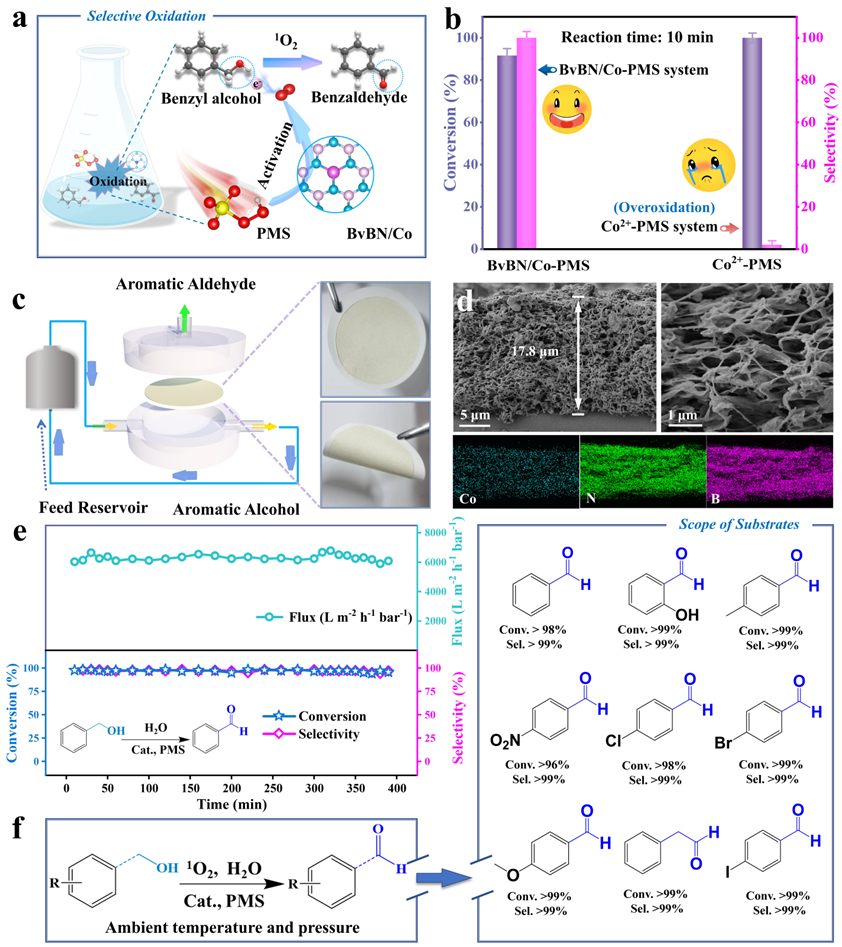 利用1O2将芳香醇选择性氧化为相应的醛,在化学工业中具有重要价值。为了验证BvBN/M-PMS体系在芳香醇选择性氧化中的适用性,作者首先以BvBN/Co-PMS体系为例来进行试验,发现在间歇式体系中反应10分钟后,苯甲醇的转化率超过91%,生成苯甲醛的选择性接近100%。为进一步提高BvBN/Co-PMS体系在芳香醛合成中的实用性,将BvBN/Co催化剂沉积在商用PVDF膜上,构建了流动式膜催化体系,可在温和条件下实现9种芳香醛的连续高效合成,选择性和转化率均接近100%。
