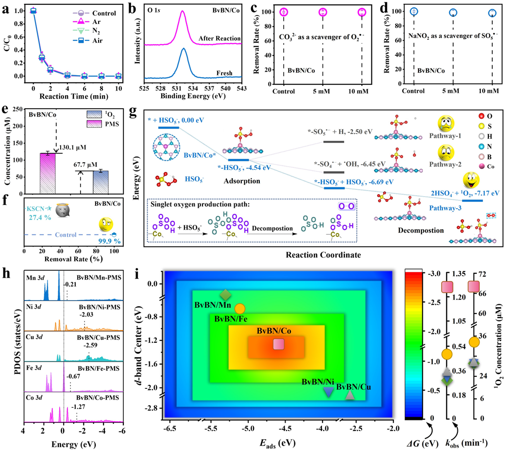 为揭示BvBN/M-PMS体系中生成1O2的反应机理,作者首先通过对比实验推断出PMS为1O2中氧的主要来源。随后,密度泛函理论计算结合实验结果证实,1O2是由两个PMS分子介导生成,没有其他中间体。另外,在反应过程中,性能最优的BvBN/Co催化剂具有适中的吸附能和d带中心,以及最低的吉布斯自由能值,这对于合理设计高性能催化材料具有重要参考意义。