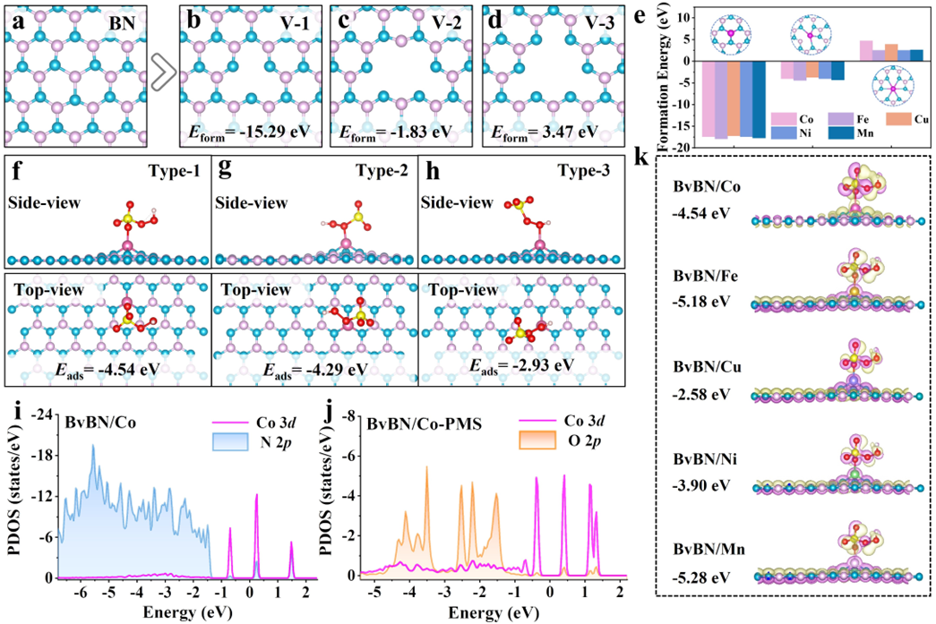 作者首先通过密度泛函理论计算来验证BvBN负载不同金属单原子活化PMS选择性生成1O2的可行性。理论计算结果表明,BvBN负载Co、Fe、Cu、Ni、Mn五种金属在热力学上均趋向于形成M-N3配位结构,并且PMS中的边缘O更容易在金属位点上发生吸附,遵循PMS活化生成1O2的吸附构型,为催化剂的设计制备提供了理论支撑。