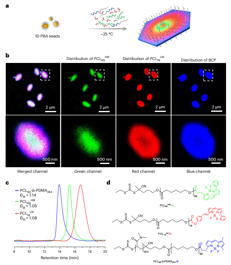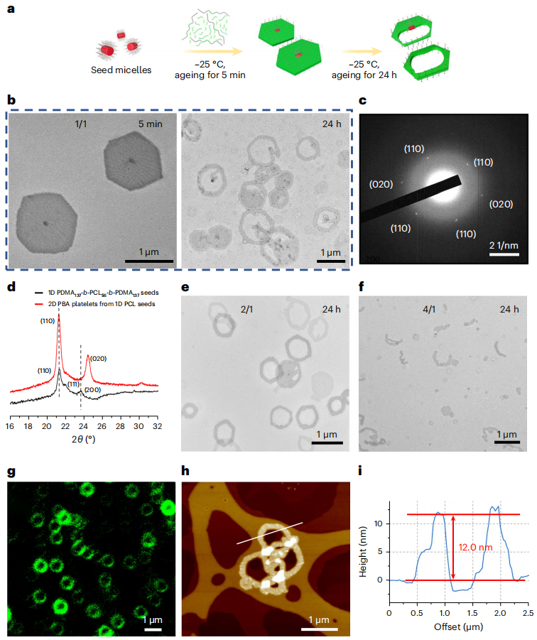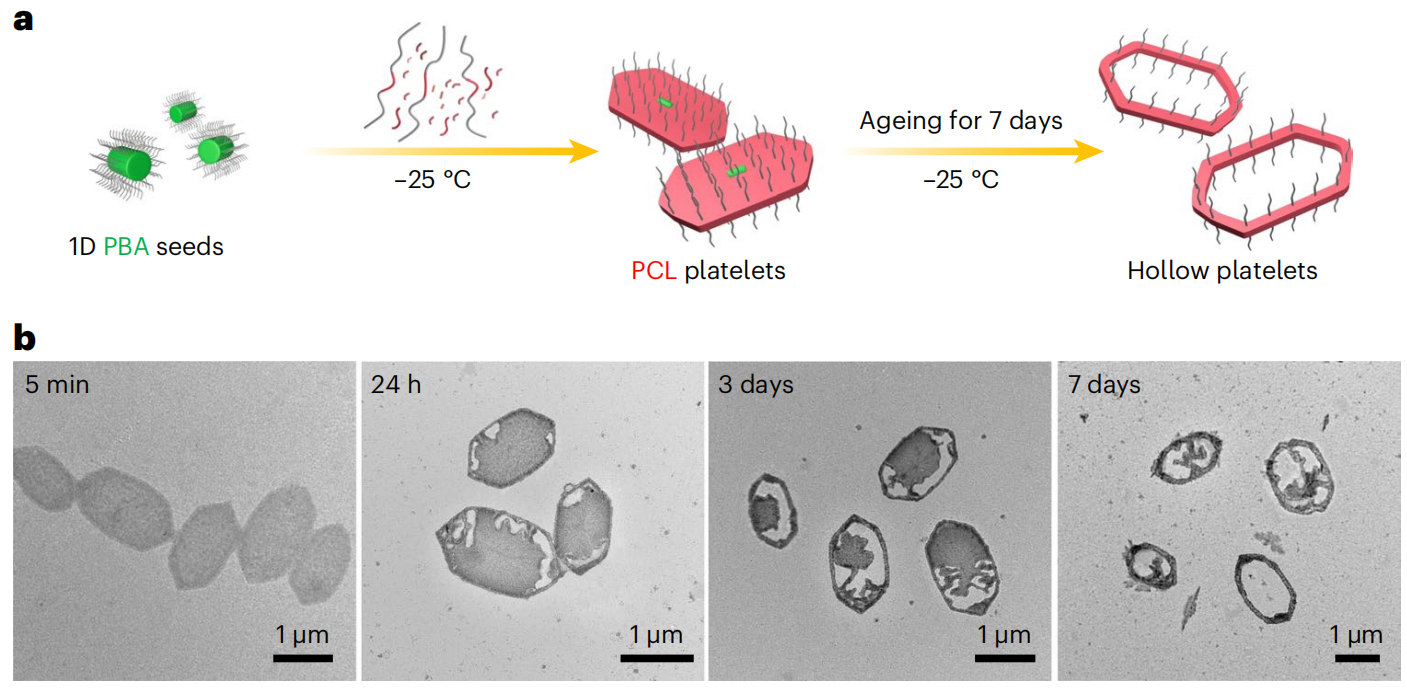 课题组在前期异质附生结晶驱动自组装研究的基础上(Nat. Chem. 2023, 15, 824),通过调控结晶策略如低分子量均聚物含量、结晶温度、结晶核的化学组分等因素,构筑了动力学捕获、亚稳程度低的二维片状胶束。这些胶束在老化过程中结晶核层发生片晶增厚现象,从而导致片状胶束的自发精确破碎。据此,利用序列种子生长技术,构筑具有含区域稳定性-非稳定性的分段式胶束,利用胶束自发精确破碎的特性实现了一步法制备具有中空结构的二维片状胶束。