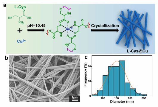 本研究首先合成了一种新型的L-Cys@Cu MOF纳米纤维,该MOF由Cu(II)和L-Cys组成,其中Cu(II)和L-Cys通过配位键连接形成MOF的基本单元,而基本单元之间则通过L-Cys的羧基(COO-)之间的离子键相互连接(图1a)。制备的L-Cys@Cu MOF纳米纤维表面光滑,直径为100 – 200 nm(图1b,c)。