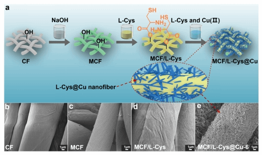 图2. MCF/L-Cys@Cu-6织物的制备流程及棉纤维表面形貌图
