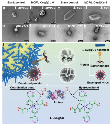 图3. 与MCF/L-Cys@Cu-6织物接触后的细菌和病毒形貌图(a-h)。L-Cys@Cu MOF纳米纤维的抗病毒机制(i)。
