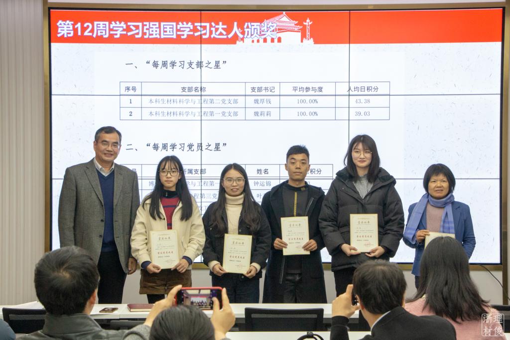 在学习强国学习达人颁奖环节,学院党委书记傅雅琴为荣获“学习支部之星”的两个本科生党支部进行颁奖,学院院长姚菊明为荣获“学习党员之星”和“学习进步之星”的10位师生党员进行颁奖并合影留念。
