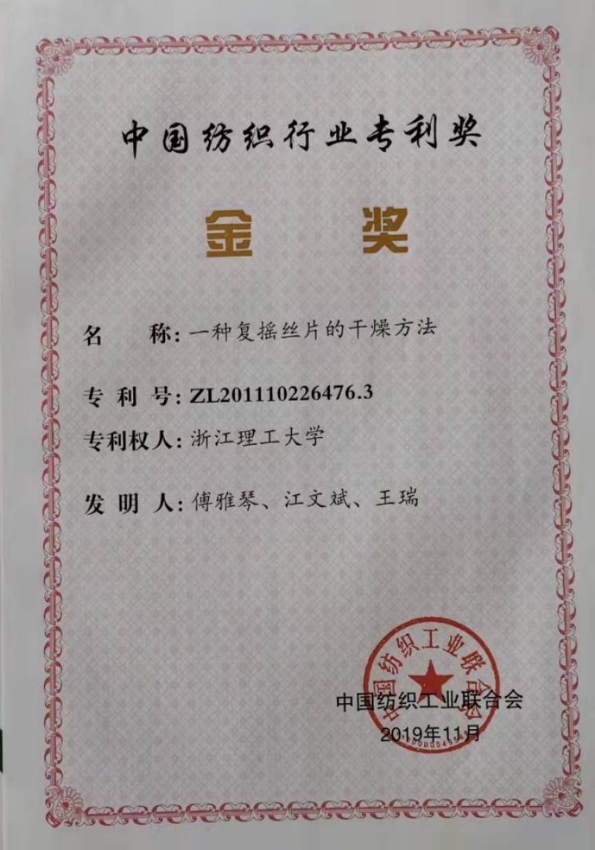 傅雅琴教授凭借“一种复摇丝片的干燥方法”获中国纺织行业专利金奖1项,在今年中纺联的纺织行业专利奖评审,15项专利获中国纺织行业专利奖金奖。