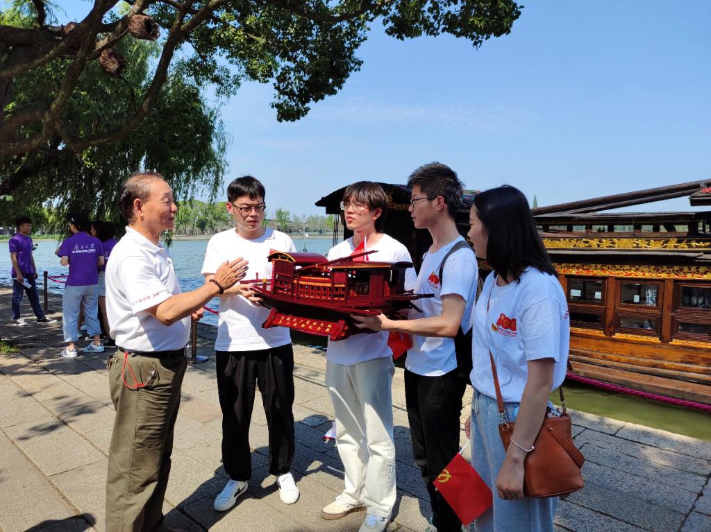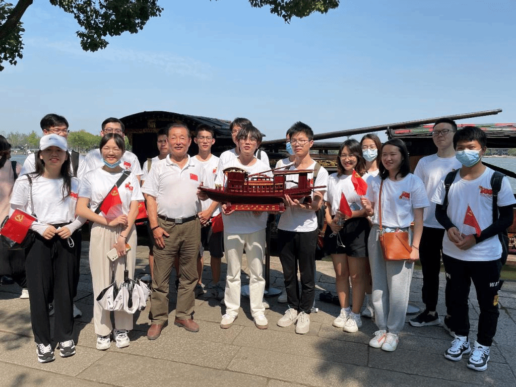在红船边,师生党员们巧遇省非物质文化遗产“南湖画舫”传承人韩鸣华老师,他带着红船模型来到红船旁。韩老师向大家介绍了自己制作红船的初心与梦想,一个个红船船模正是他与红船所结下的不解之缘,而让红船驶向世界、驶向每一个人的心中也是他的愿望。随后大家举起手中的党旗与“红船”合影留念,感受红船所代表和昭示的时代高度与发展方向,这是铸就在中华儿女心中永不褪色的精神丰碑。