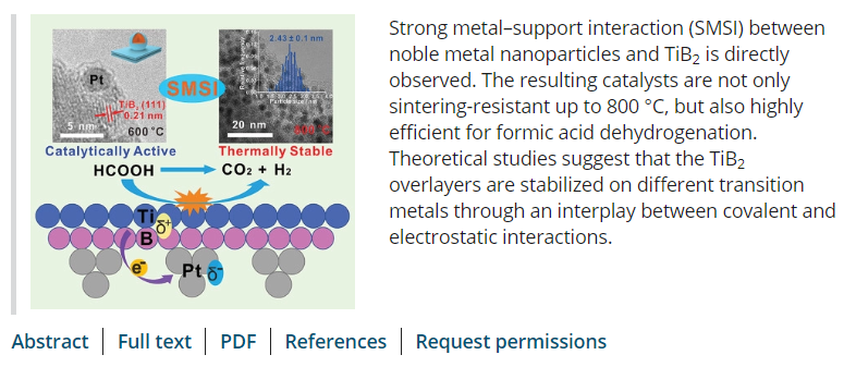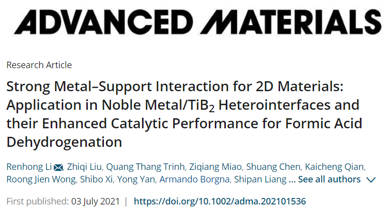 副教授李仁宏在国际顶级期刊Advanced Materials(影响因子:30.8)上发表题为《Strong Metal-Support Interaction for 2D Materials: Application in Noble Metal/TiB2 Heterointerfaces and their Enhanced Catalytic Performance for Formic Acid Dehydrogenation》的文章,报道了课题组在高温抗烧结纳米催化材料领域取得的突破性成果。