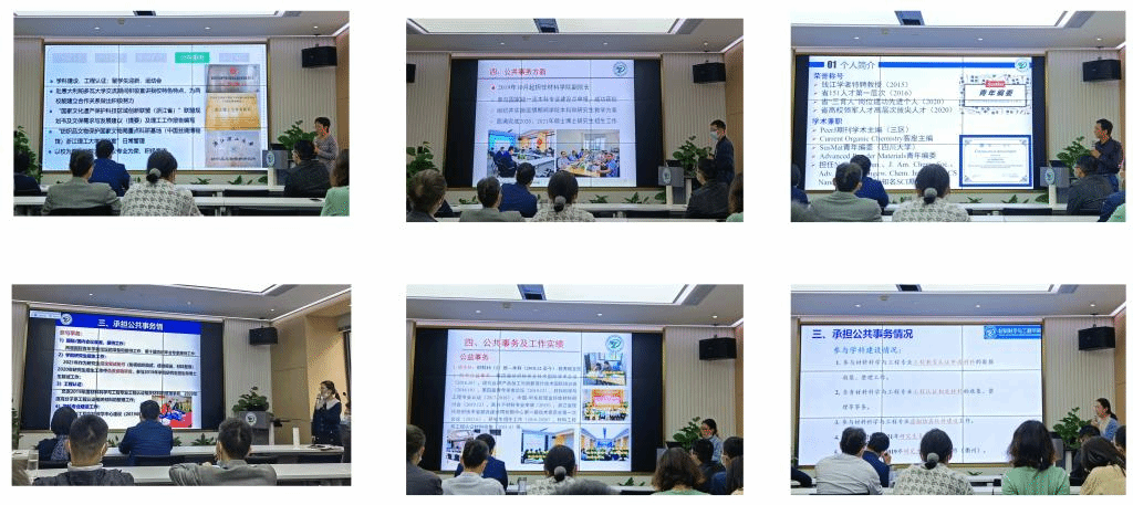 随后学院十位申报人员分别从本人的思想政治表现、职业道德,以及承担学院公共事务情况及自身工作实绩等方面进行了公开述职。在述职报告结束后,全体参会人员按照会议要求,对符合相关申报条件的十位教师进行了民主测评。最终,考核推荐组综合申报人员所在系(所)或部门、党支部推荐意见和民主测评结果,明确推荐意见。