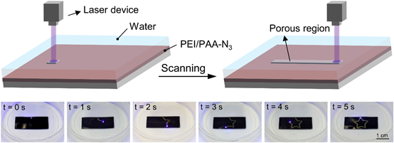 青年教师陈夏超在国际高水平期刊《Advanced Functional Materials》(影响因子:18.808)上发表题为《Laser-Directed Foaming of Hydroplastic Polyelectrolyte Films towards Tunable Structures and Programmable Routes》的研究论文。该工作在近期已报道的水塑性聚电解质材料(Chemical Engineering Journal 2021, 425, 131445)基础之上,首次提出利用水下激光发泡技术制备聚电解质微孔薄膜的新技术,开拓性地将传统气体发泡方法应用于超薄聚电解质薄膜的微观结构调控,并通过界面浸润性转变有效避免了常规液相致孔后出现的孔道坍塌效应,大幅度降低了聚电解质微孔薄膜的制备难度,并实现了微孔结构的精确区域调控。