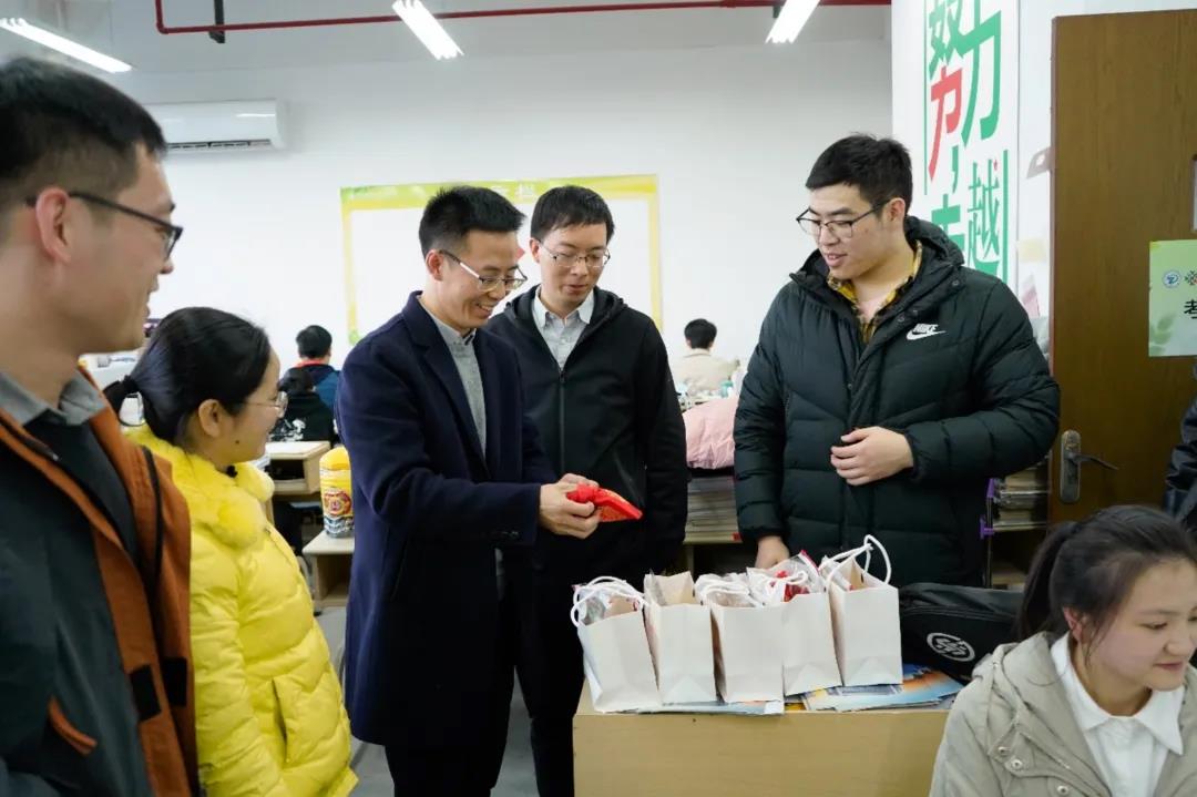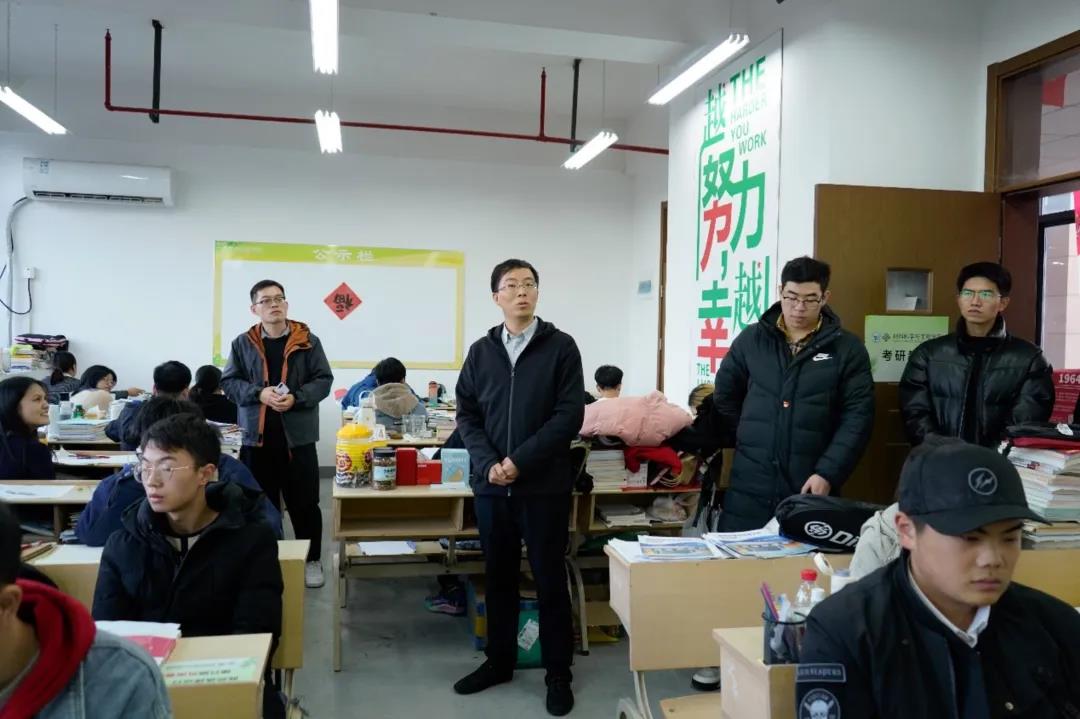 举行2022届考研冲刺慰问会。学院考研护航特设党支部邀请学院副院长杨叶锋老师、党委副书记、纪委书记周照东老师,学院团委书记、学工办主任张姗姗老师、本科毕业班辅导员魏厚钱老师走进考研教室,为考研同学加油打气并送上暖心慰问物资。