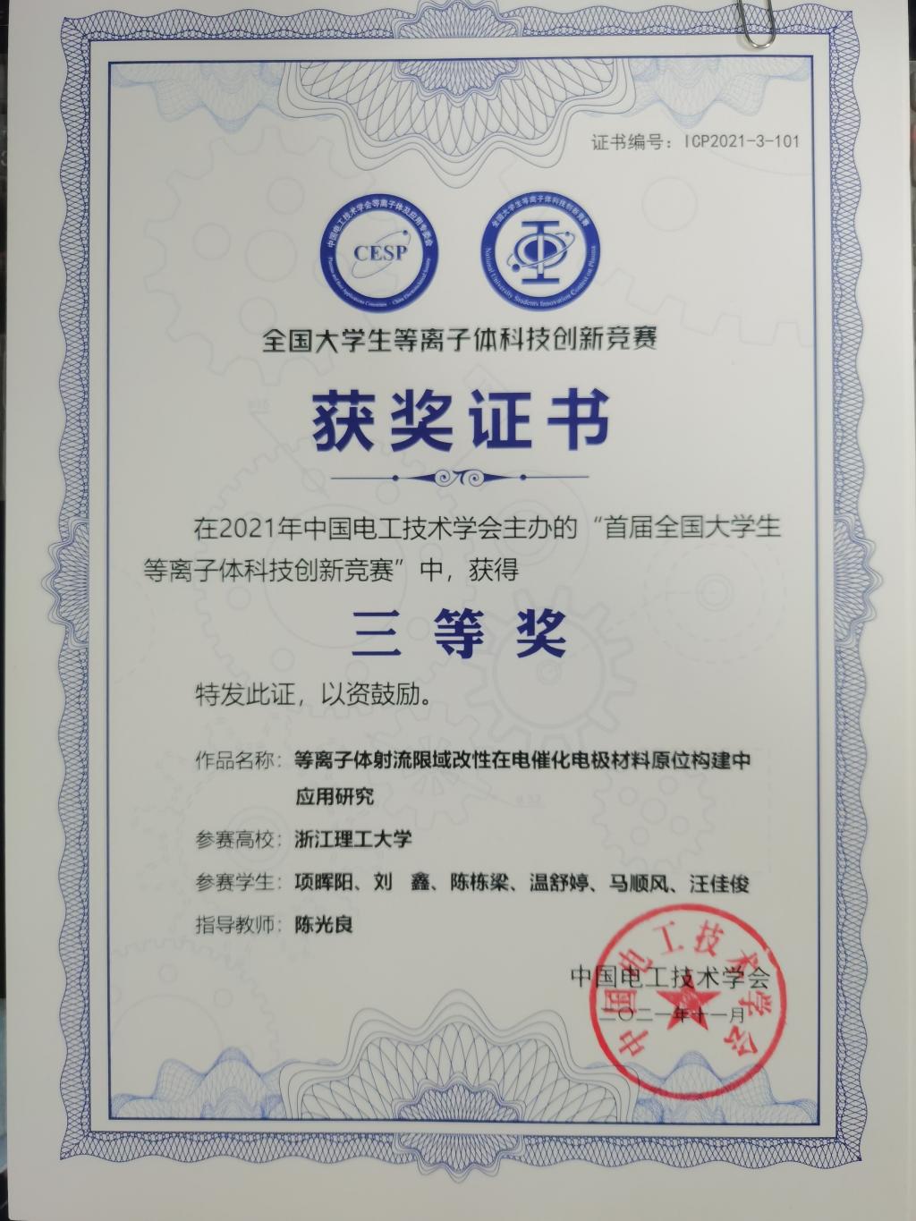 陈光良老师指导的研究生团队作品《等离子体射流限域改性在电催化电极材料原位构建中应用研究》获得三等奖。