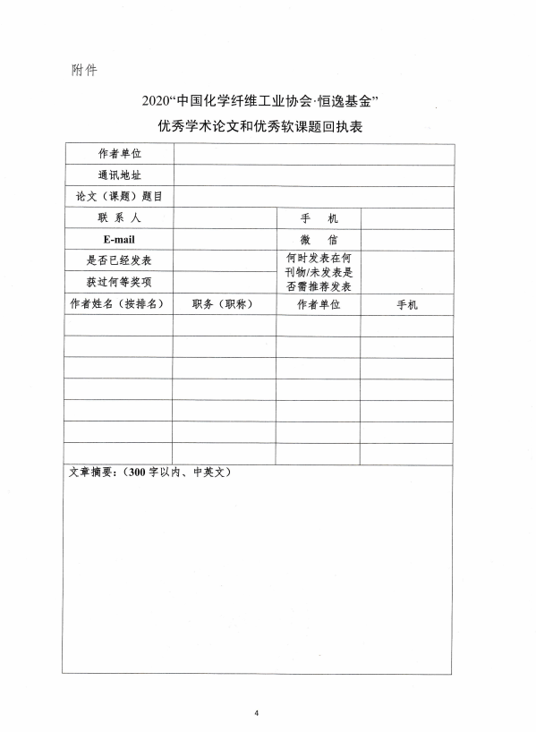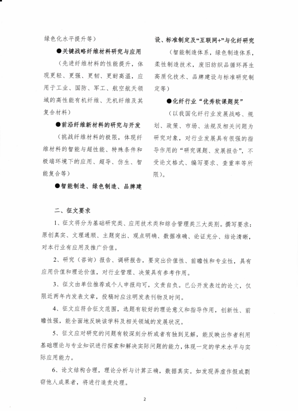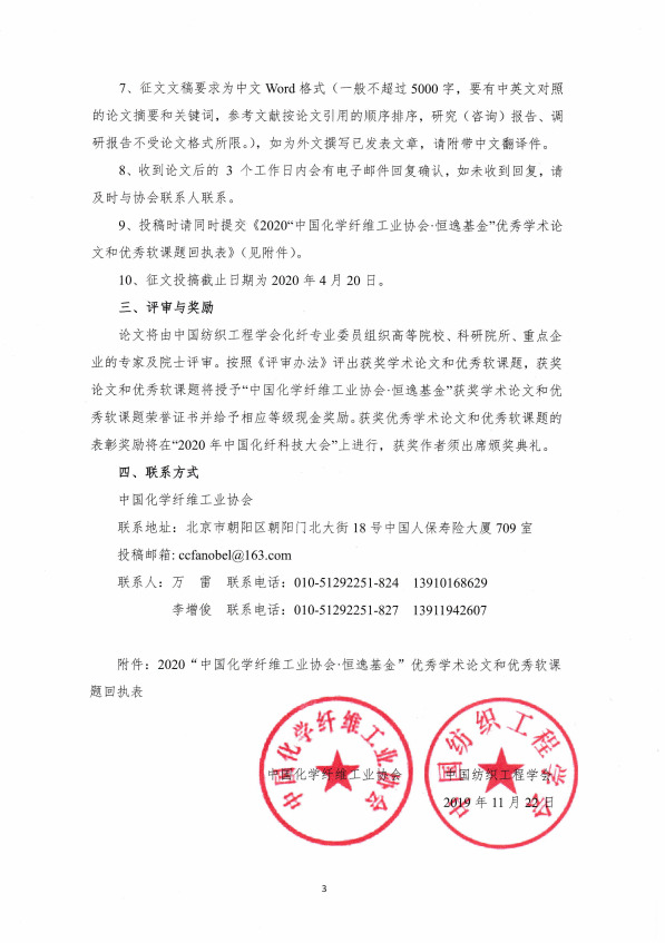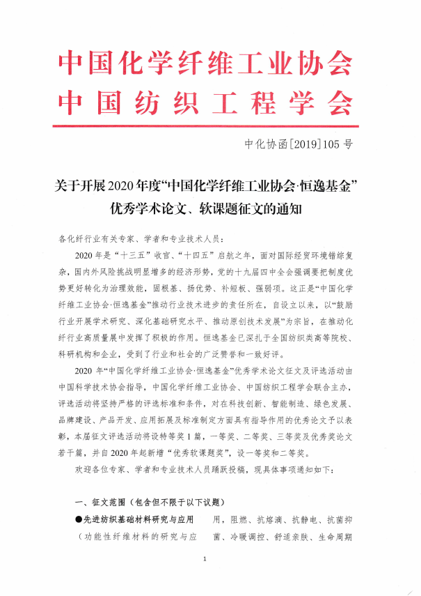 科研通知 当前位置: 黑沼泽俱乐部 > 科研通知 > 正文 关于2020年度“中国化学纤维工业协会·恒逸基金”优秀学术论文、软课题征文的通知 作者:时间:2020-03-23浏览次数: 各位老师: 2020年度“中国化学纤维工业协会·恒逸基金”优秀学术论文、软课题征文截止时间为:2020年4月20日,各位老师投稿时需提交《回执表》(附件)。 附件【关于组织申报2020年度“恒逸基金”优秀学术论文的征文通知-01稿(发文稿).doc】已下载次 附件【附件--征文回执表.docx】已下载次