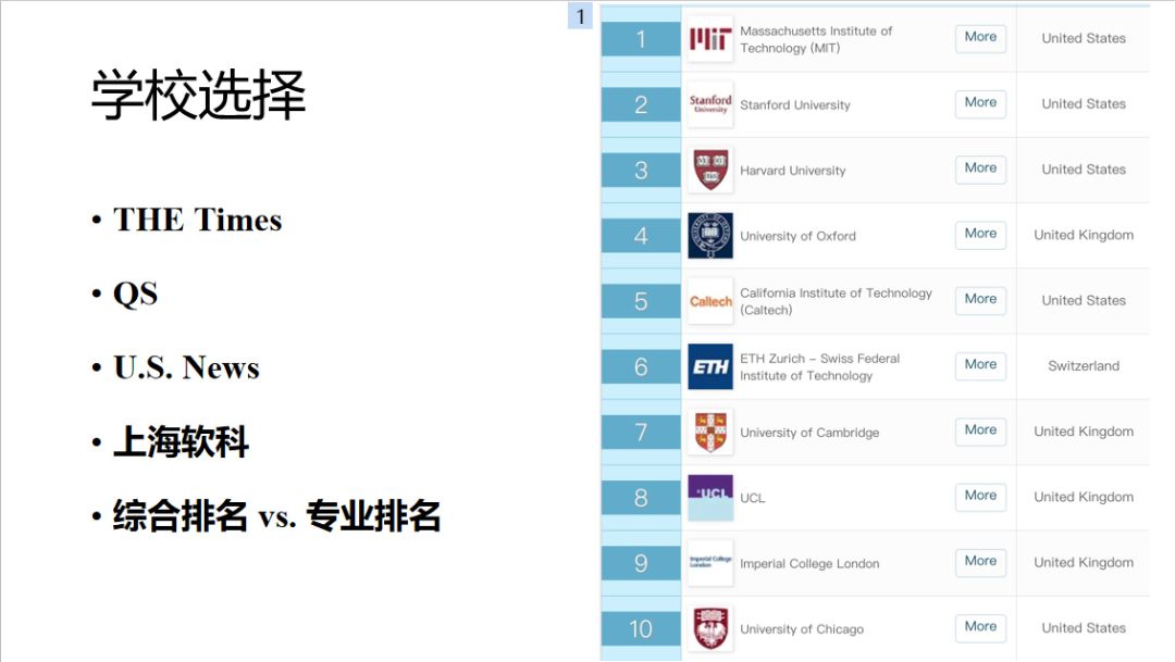 而对于院校的选择,主要的参考依据有两种。一个是院校的综合排名,另一个则是专业排名。对于就业导向的学生,也就是学成之后希望进入企业工作的同学,建议采用综合排名,因为你的面试官并不一定就真的了解你的专业的排名情况,但对学校的综合排名肯定是有所耳闻的;而对于研究导向的同学,肯定是选择专业排名更好的学校,以获取更先进和全面的科研资源。以上是四个主要的排名榜单,各自有独特的特色,都可以参考一下。而以QS排名为例,可以对专业、地区、学位进行院校筛选和比对。