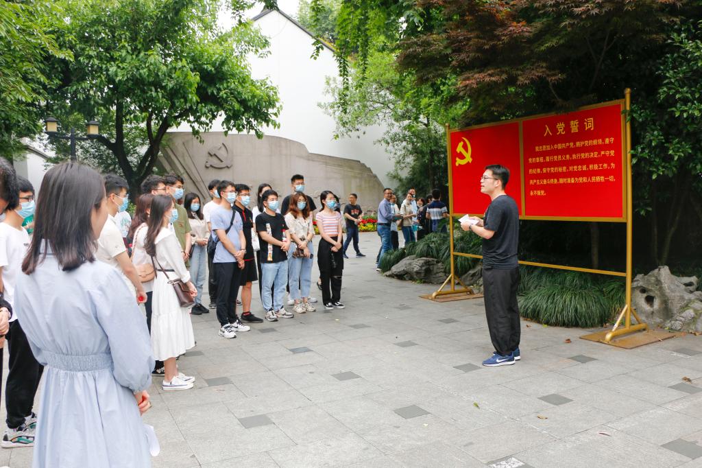 在中国共产党杭州历史馆宣誓墙前,学院组织员魏厚钱以“为什么大地春常在—致敬党史上的每一位英雄烈士”为主题进行党史课的分享,从《英雄儿女》中的王成,到《我和我的祖国》里的“前夜”,与大家分享了为新中国献身的广大英烈的故事。“为什么大地春常在?为什么战旗美如画?”正是一代代先辈的前赴后继,才有了我们现在衣食无忧,昌盛强大的祖国。最后,魏厚钱老师为学员们讲述了小萝卜头的故事:一个从小在监狱长大的男孩,通过定期的学习“特权”,以特殊的方法为中共传递重要情报,在8岁时被国民党残酷杀害,他却成为了中国历史上年龄最小的烈士,启发在场党员们要懂得感恩,“吃水不忘挖井人”,认真思考在今后的学习生活中能做些什么?