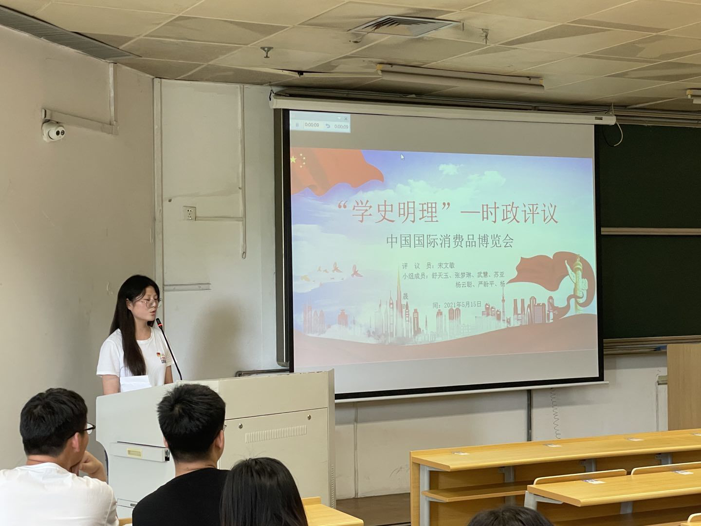 B5组的宋文敏同学以翔实的图文介绍了5.15的中国国际消费品博览会;B7组的徐路同学感情真挚的控诉了西方对新疆棉花荒谬的造谣诽谤;B8组的张伟同学带领我们缅怀了5.10洱海坠机事件中救人民与水火时不幸牺牲的英雄;B9组的王飞龙同学用一个个真人真事论证了汶川地震中党员的先锋模范作用;B10组的朱娇艳同学以4月23日外交部王毅部长与美国对外关系委员会的视频通话为切入点讨论了近期中美关系的走势和我国的立场。